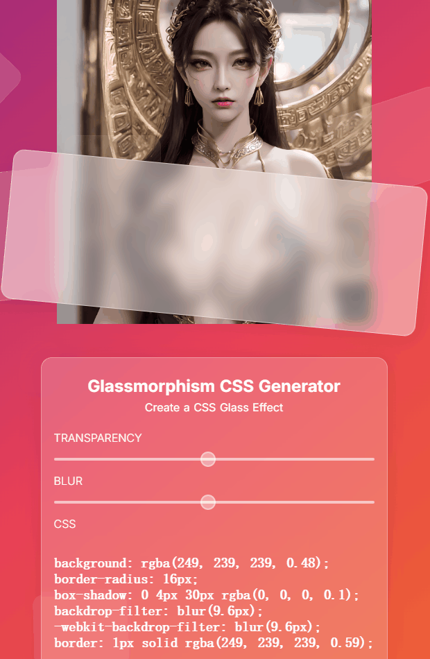 话不多说;拿我的AI小助理照片实验了一下;上面加一层毛玻璃,拖动滑块分别改变透明度和模糊度;效果很明显。