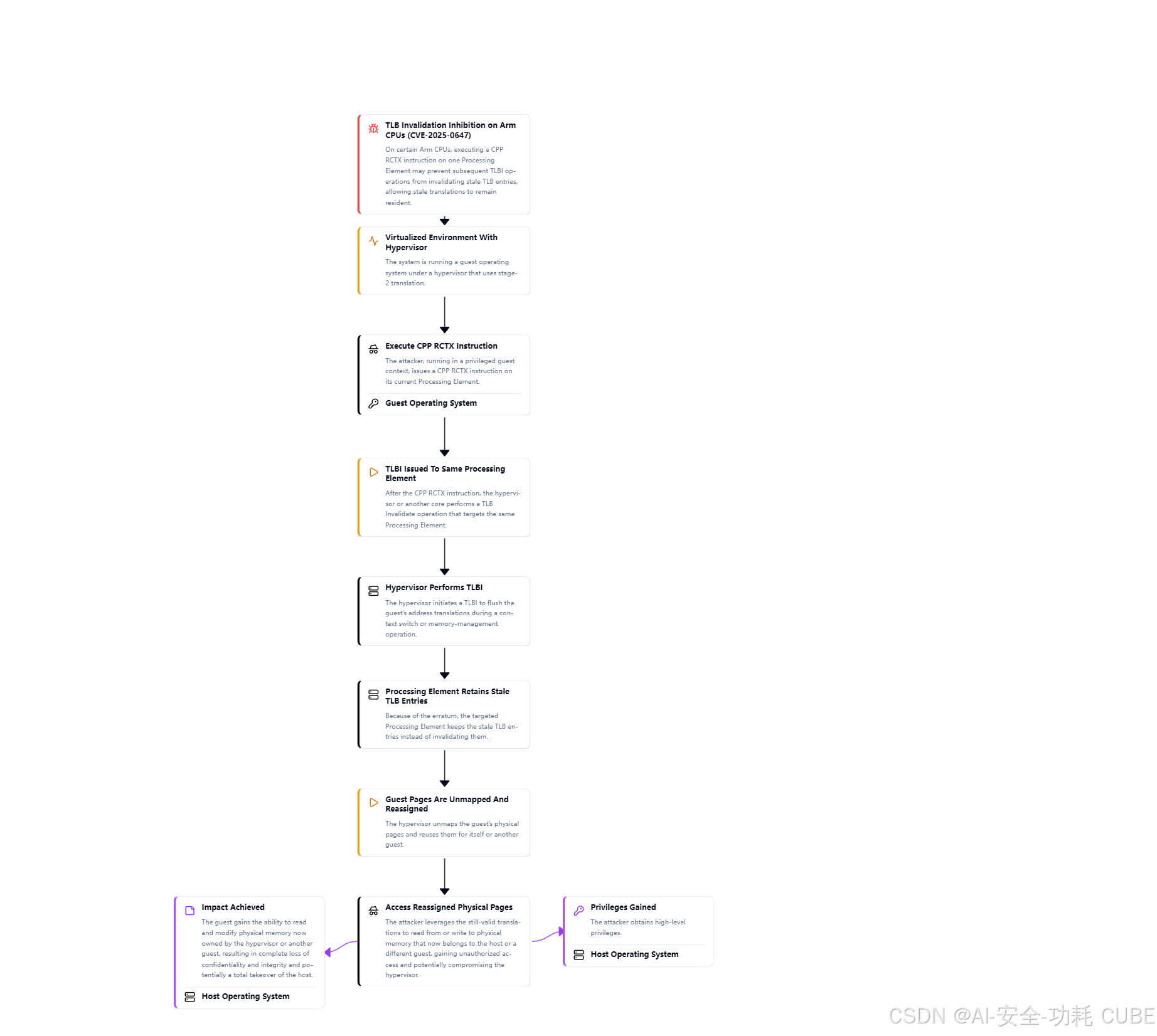受影响的 Arm 处理器允许特权级guest(privileged guest)执行 CPP RCTX 指令,该指令会抑制同一核心上后续的 TLB(Translation Lookaside Buffer,地址转换后备缓冲区)失效操作。