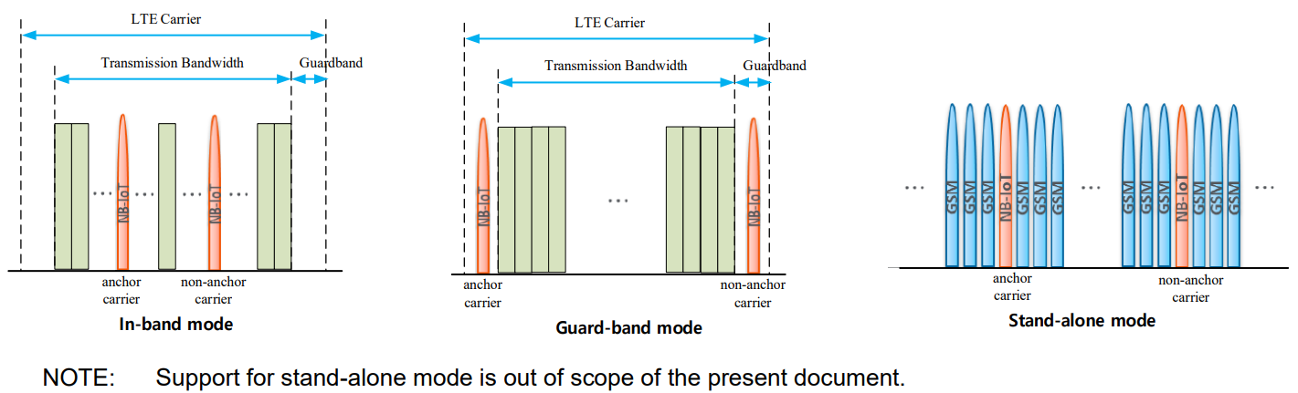 - 对于guard-band模式,一个NB-IoT载波位于一个LTE/NR主载波的保护带,其位于主载波信道带宽内部,但位于传输带宽的外部。