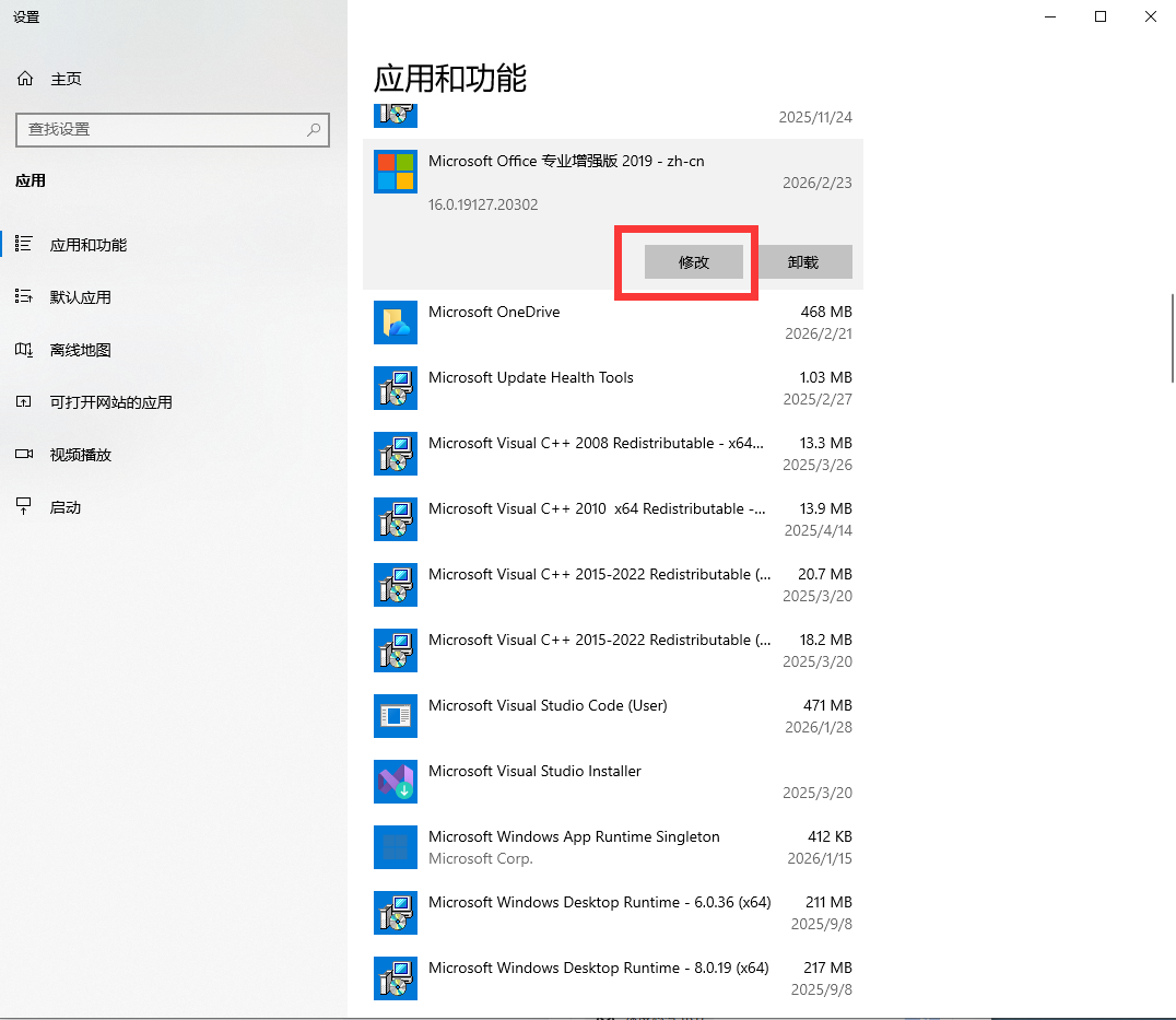 在系统设置-应用和功能里找到Microsoft Office,点击修改