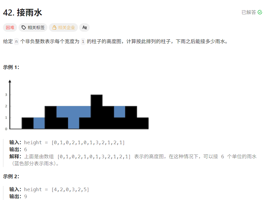// 积水的高度 = 左右两墙的较矮者 - 坑底的高度