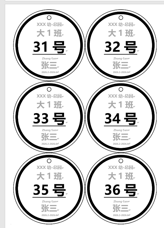 制作被子圆牌(word合并)多个班级-凑满整夜,如托班20人,凑满6*4页、中班30人,凑满5页,不存在的名字都是"张三"占位用,以后有插班生就可以自己修改名字了