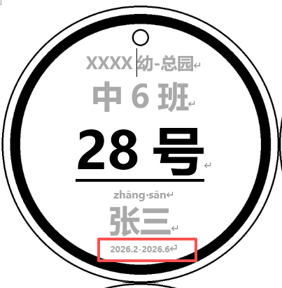 制作被袋上的圆形挂牌,第一次打印的是,没有学校、没有园区的挂牌