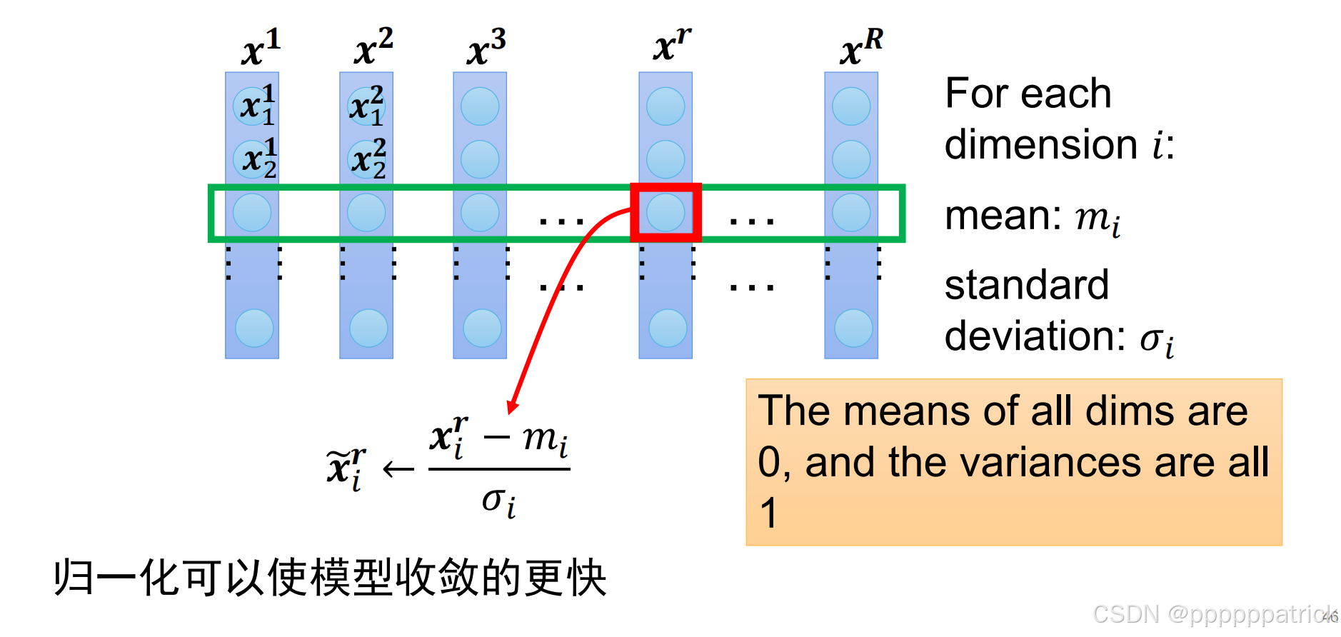 - 公式 :对每个特征维度 i i i,计算其在整个数据集上的均值 m i m_i mi 和标准差 σ i \sigma_i σi,然后进行标准化: