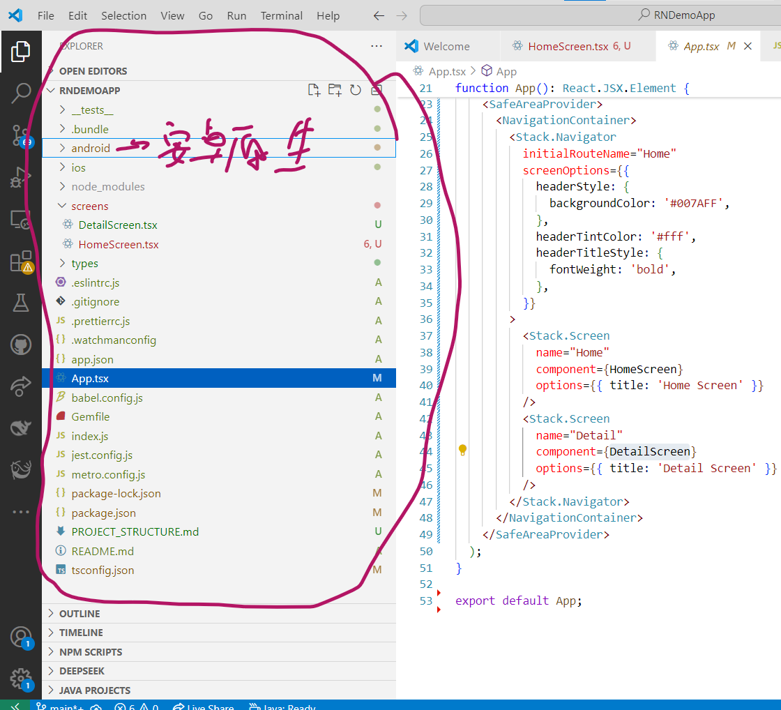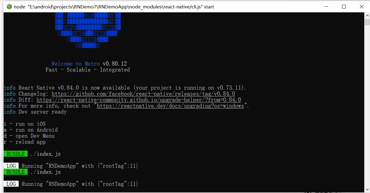 ok. 当有修改时,同步原生功能,再在工程根目录(E:\android\projects\RNDemo7\RNDemoApp)中执行:npx react-native run-android。 如果是修改RN代码, 只要下面Metro服务还在运行,保持会自动热更新,很方便。