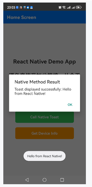 const result = await NativeDemoModule.showToast('Hello from React Native!');