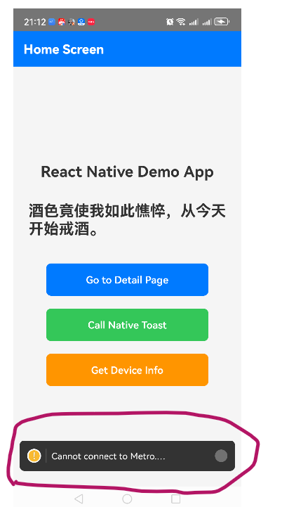 ok. 调试时当Metro服务被关闭,页面会显示Cannot connect to Metro: