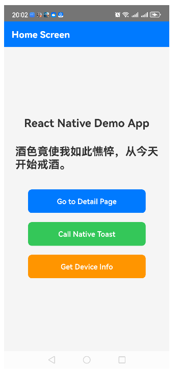 写了一个React Native demo,包含页面间跳转逻辑,包括安卓原生和JS接口的互相调用。页面如下。