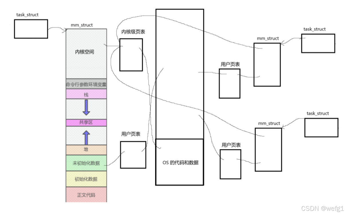 在电脑开机时,OS 是最先加载的软件,它的代码和数据存储在物理内存地址较低的地址,进程的内核空间在进行虚拟到物理的映射时,有一个专门的页表存储映射关系,叫内核级页表 。地址空间的用户空间在进行虚拟到物理的映射时,所使用的页表可以叫做用户页表。有多少个进程,就有多少个用户页表,但内核级页表只有一个,即所有进程共享一个内核级页表,因为所有进程的内核部分共享内核代码和数据。