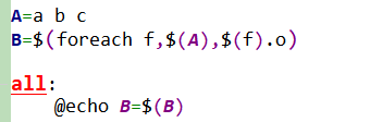 =定义。其值在被引用时才确定。A = $(C) # A的值会等到被使用时才去查找C B = 100 C = 200 D = $(A) # 此时A展开为$(C),而C的值为200,所以D=200应用:延时变量常用于定义递归展开的变量,比如工具链前缀。