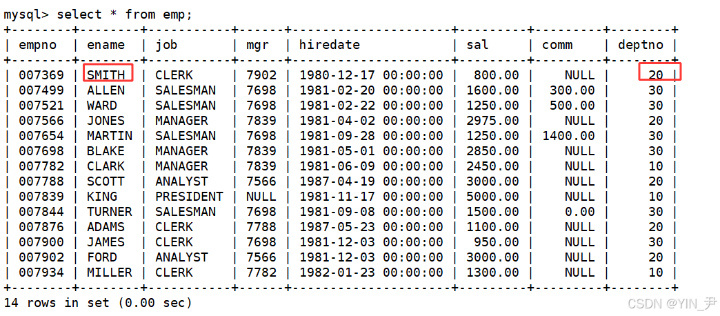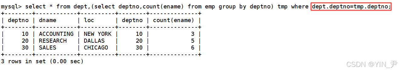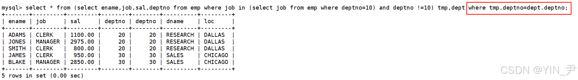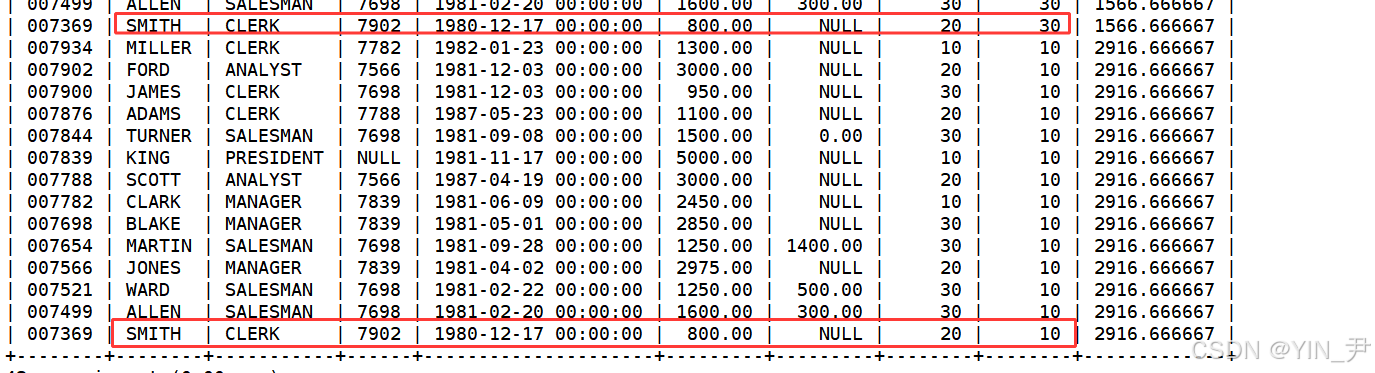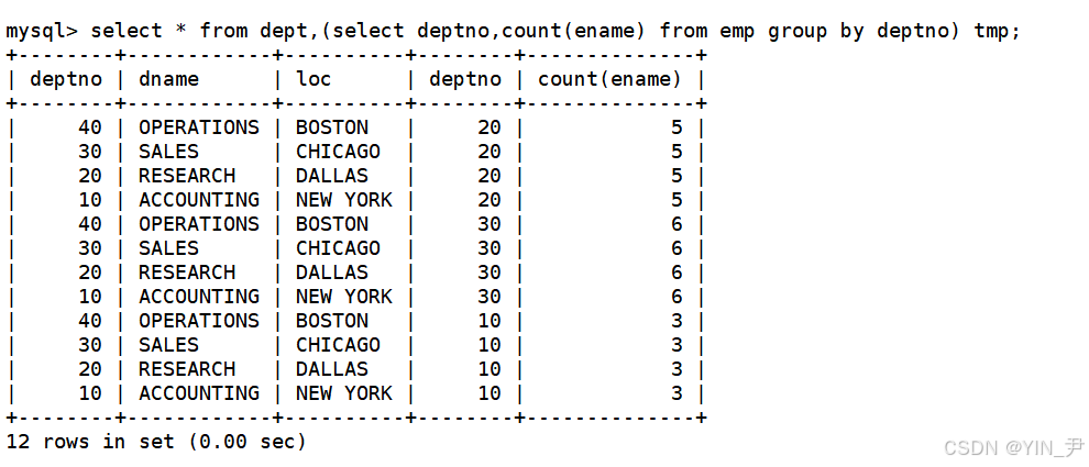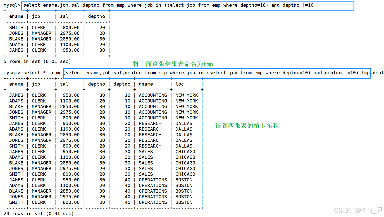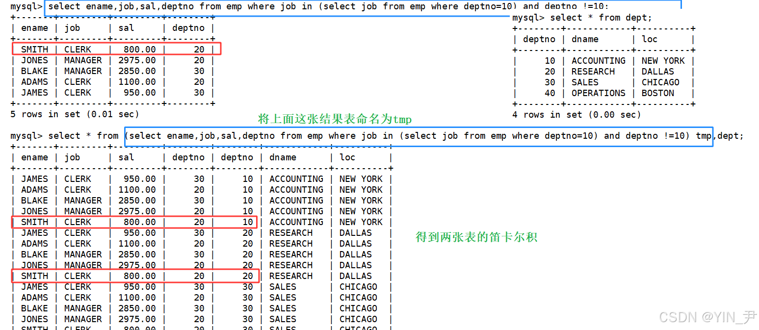 那同样的,我们说过很多遍了,笛卡尔积中通常是有很多的无意义数据的,比如SMITH这个人,他所在的部门是确定的,那他与tmp表中其它部门的信息组合是无意义的