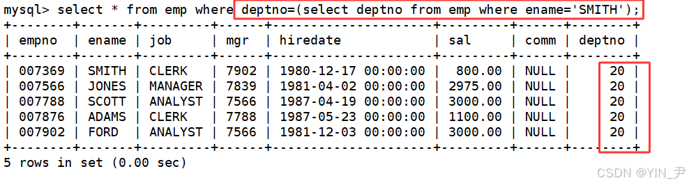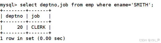 其中select deptno from emp where ename='SMITH'即为子查询语句,它只返回一行结果(且单列),故称为单行子查询。