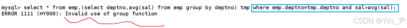 但是这样写是不行的,之前文章讲过where子句中不能使用聚合函数。所以可以给avg(sal)这一列进行一个重命名