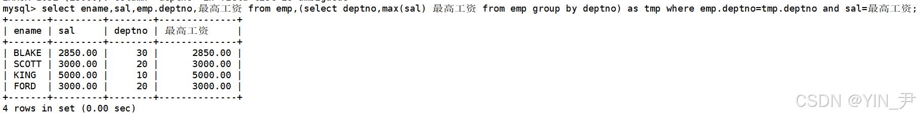 select ename,sal,emp.deptno,最高工资 from emp,(select deptno,max(sal) 最高工资 from emp group by deptno) as tmp where emp.deptno=tmp.deptno and sal=最高工资;