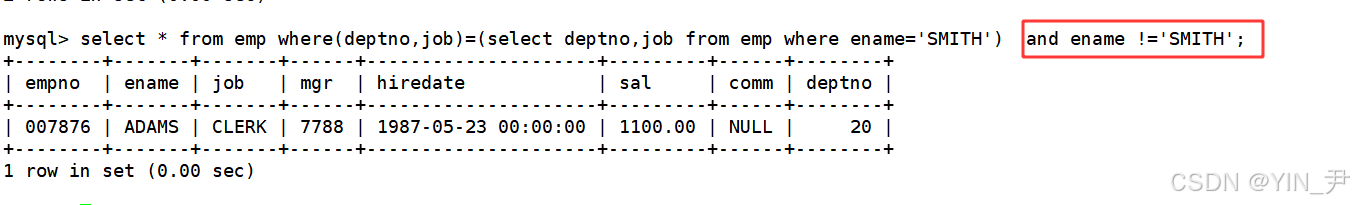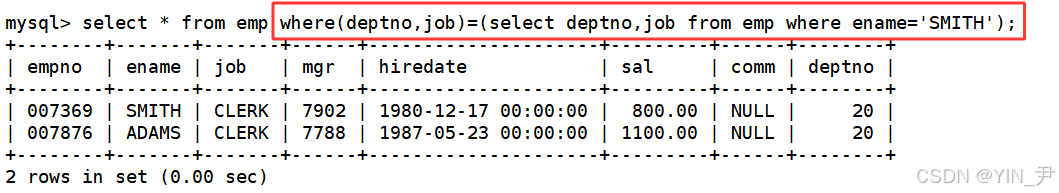 select * from emp where(deptno,job)=(select deptno,job from emp where ename='SMITH');