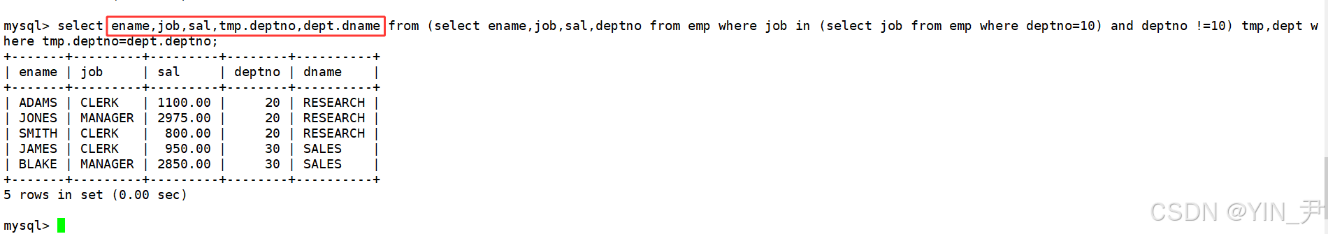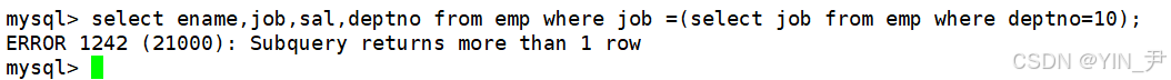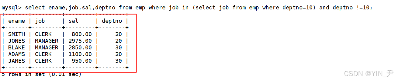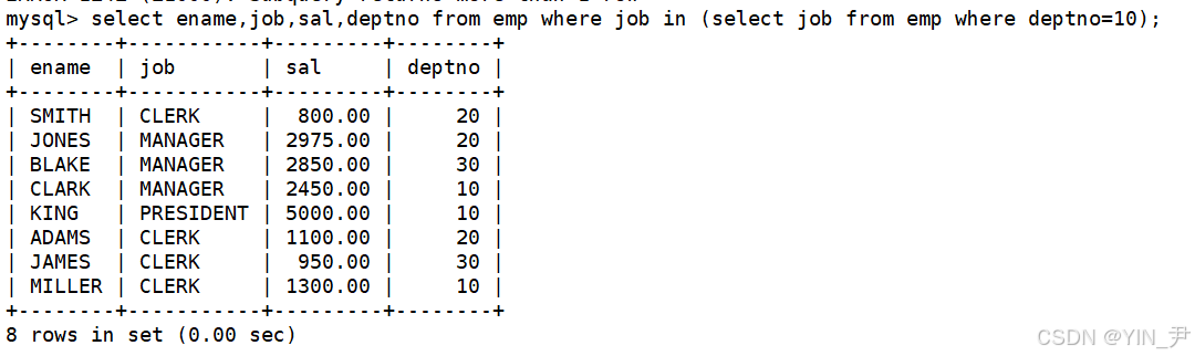 没有问题,这里的子查询语句select job from emp where deptno=10;返回了多行结果(单列),这也是为什么叫做多行子查询 的原因。
