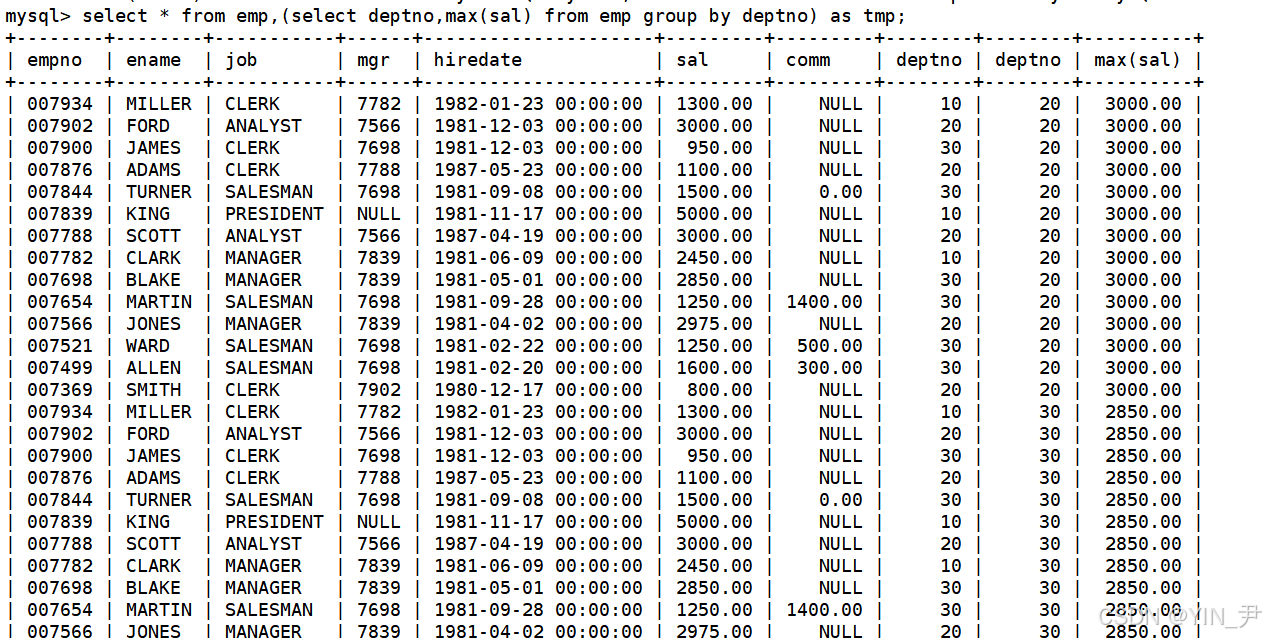 select * from emp,(select deptno,max(sal) from emp group by deptno) as tmp;