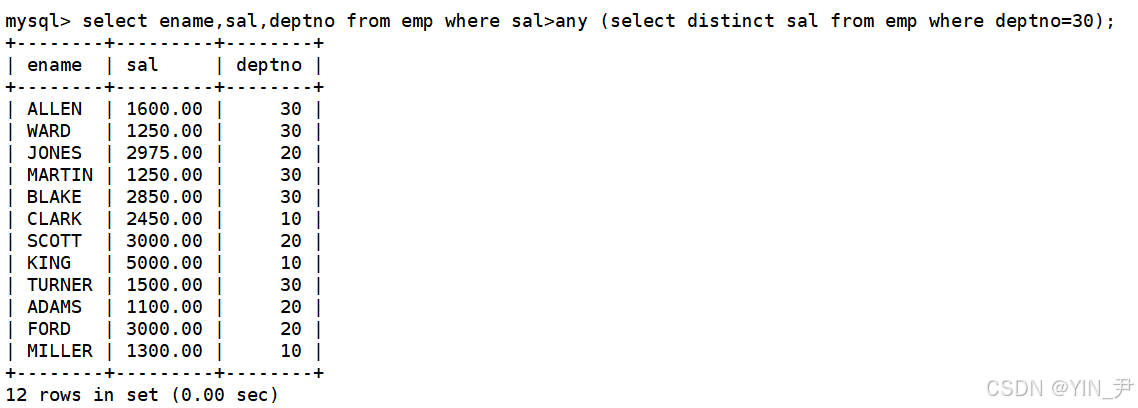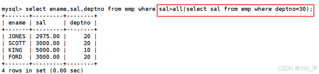 select ename,sal,deptno from emp where sal>all(select sal from emp where deptno=30);