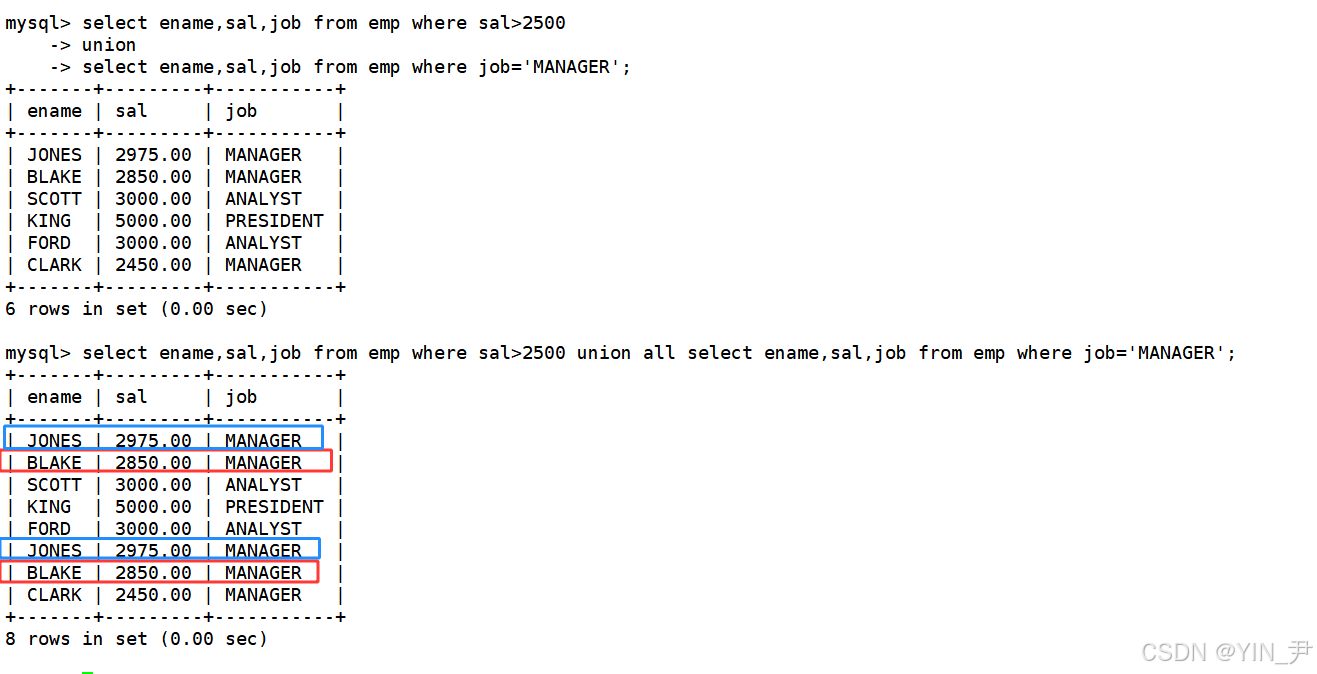 select ename,sal,job from emp where sal>2500 union all select ename,sal,job from emp where job='MANAGER';