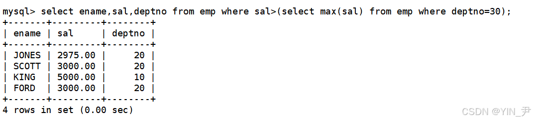 所以,总结一下就是要显示工资比30号部门的最高工资还高的员工的姓名、工资和部门号