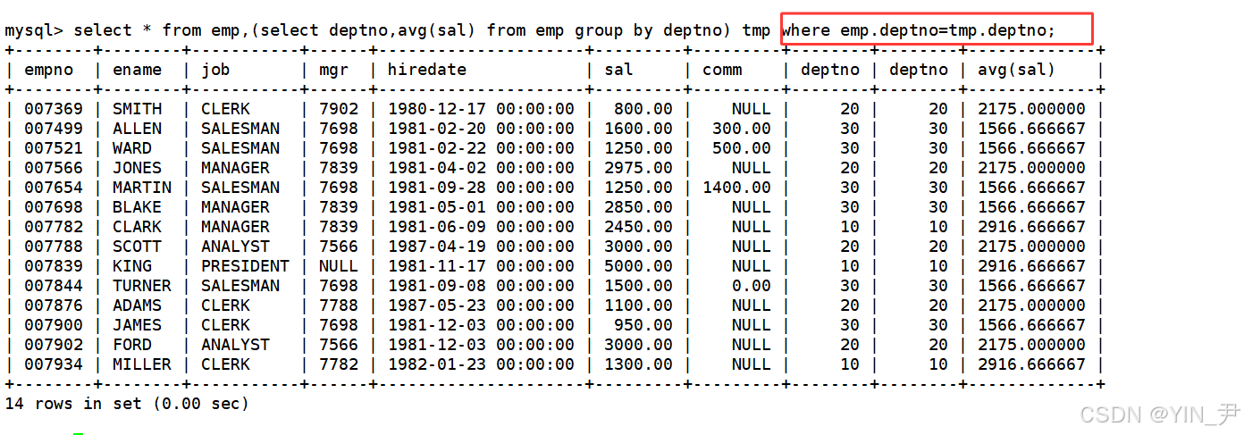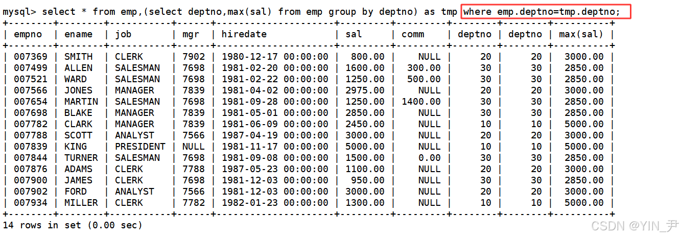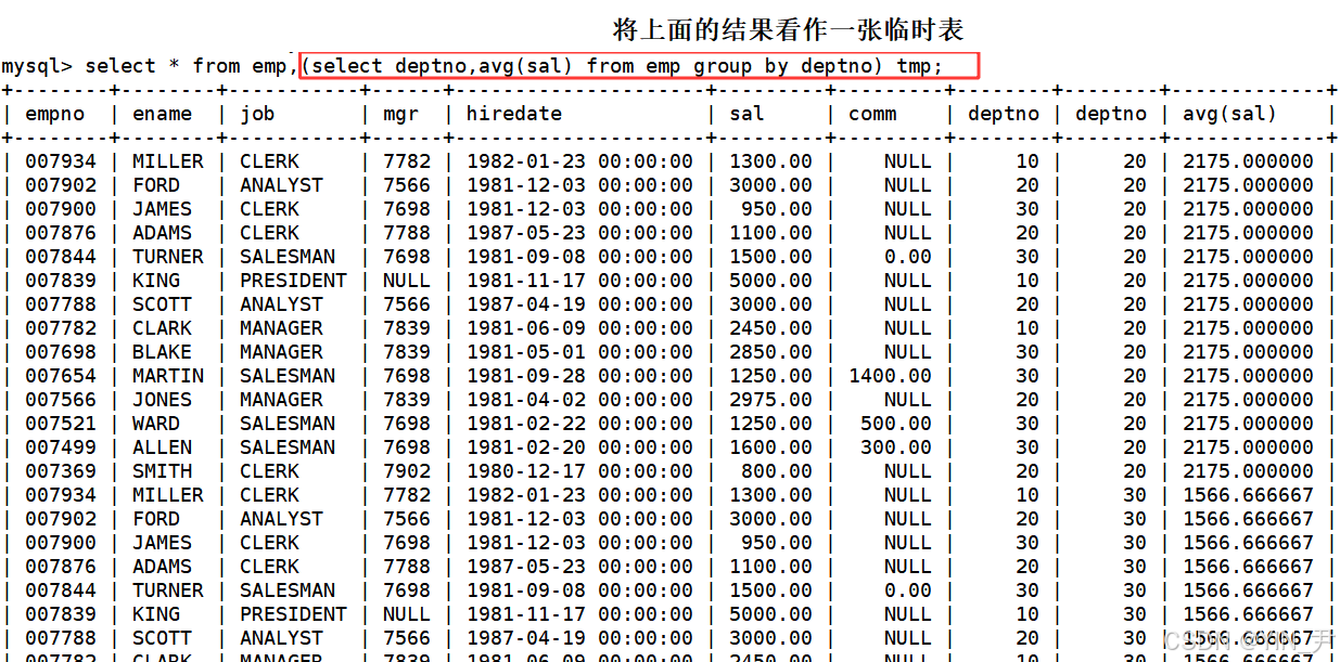 那emp表中是没有最高工资的,但是上面结果的这个临时表中有,那我们就可以考虑这两张表做笛卡尔积,然后结果中不就直接包含我们想要的所有信息了嘛