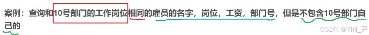 - 案例:查询和10号部门的工作岗位相同的雇员的名字,岗位,工资,部门号,但是不包含10号部门自己的