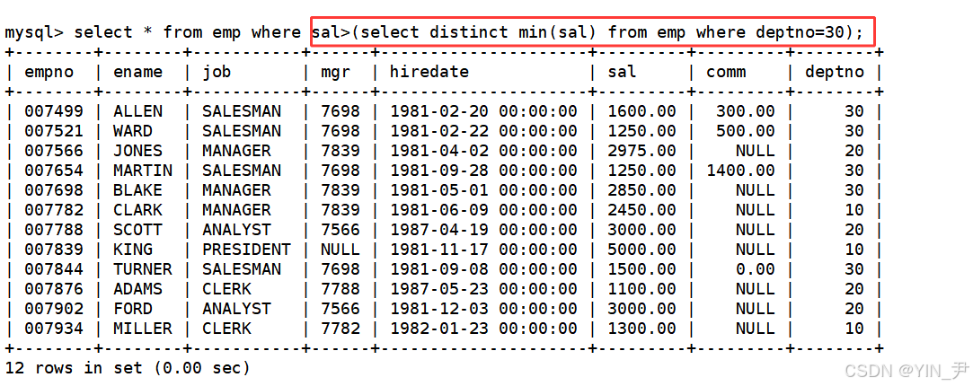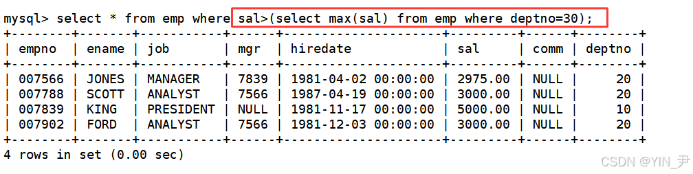 子查询语句select distinct sal from emp where deptno=30返回了多行,我只要比其中一个高就行了