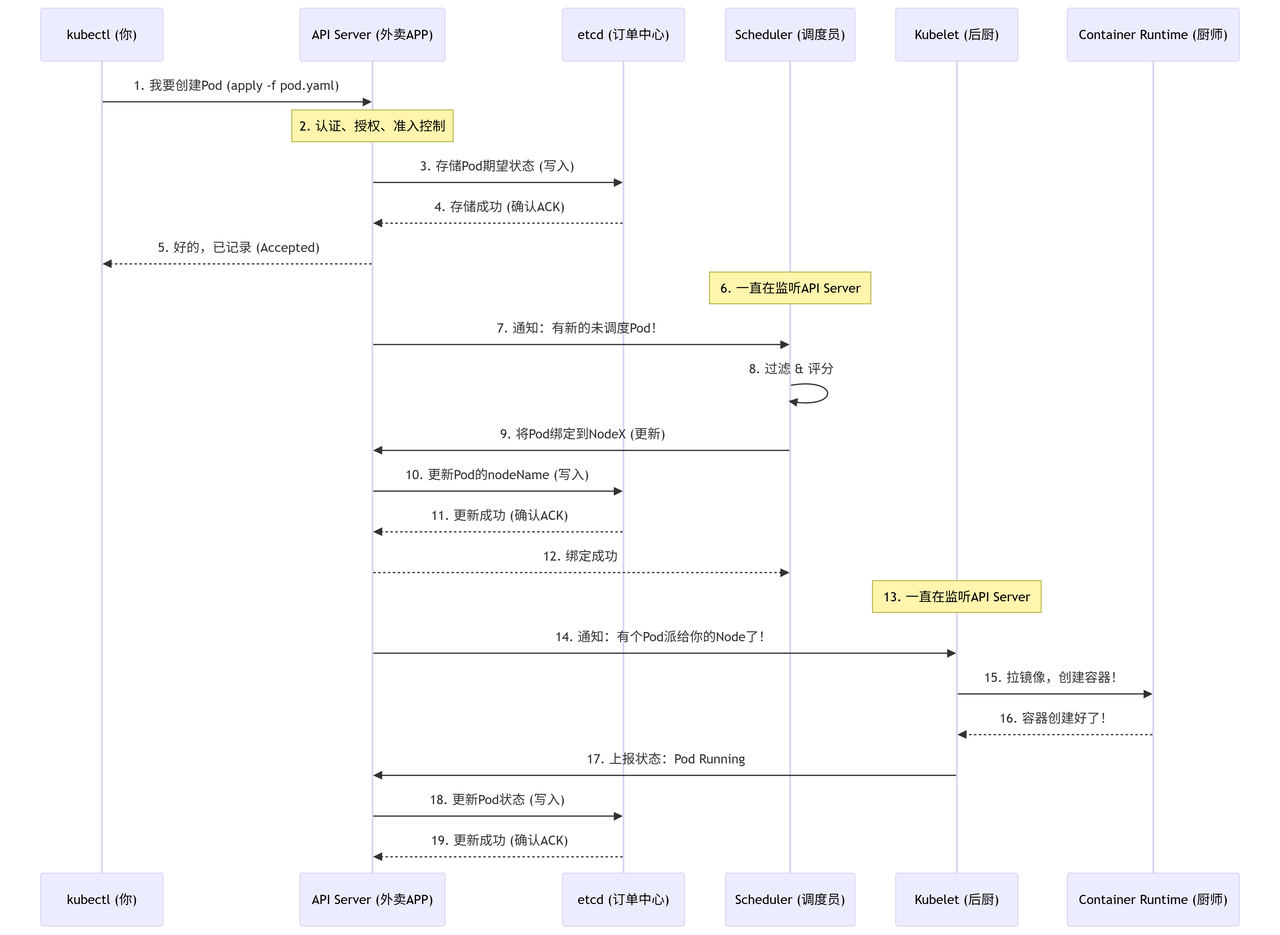 用户通过kubectl提交Pod创建请求,API Server进行校验后,将Pod的期望状态写入etcd并持久化。写入成功后,API Server返回响应,此时Pod已被记录但尚未调度。
