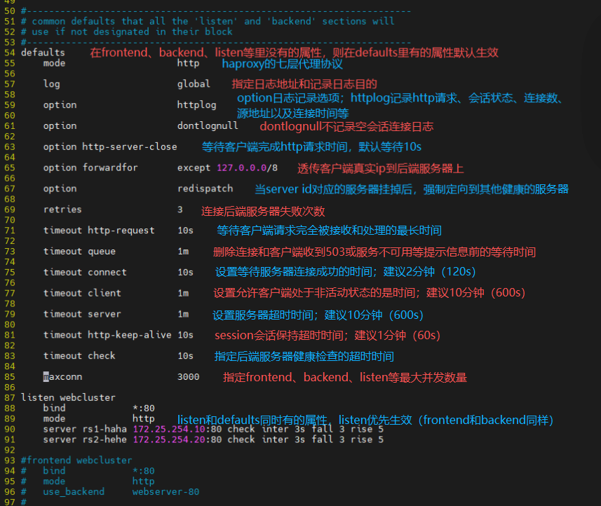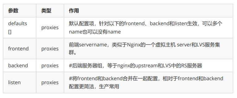 - defaults:为frontend, backend, listen提供默认配置