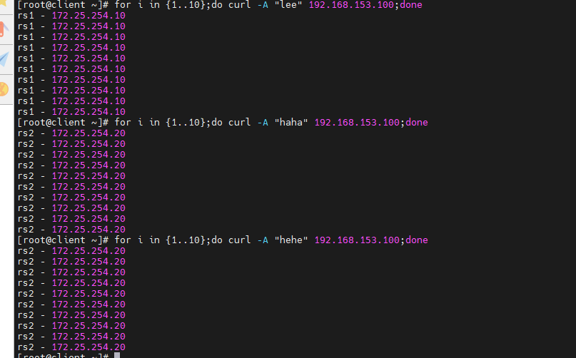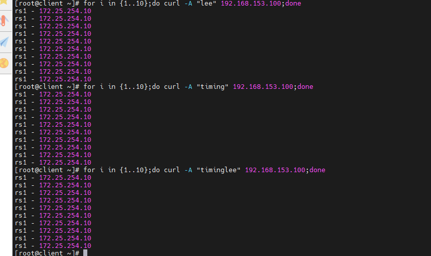 [root@rs1 ~]# echo lee - 172.25.254.10 > /var/www/html/lee/index.html