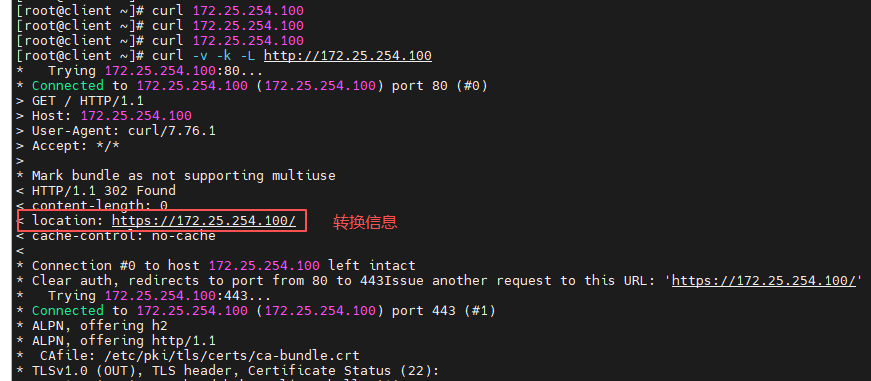 [root@client ~]# curl -v -k -L http://172.25.254.100