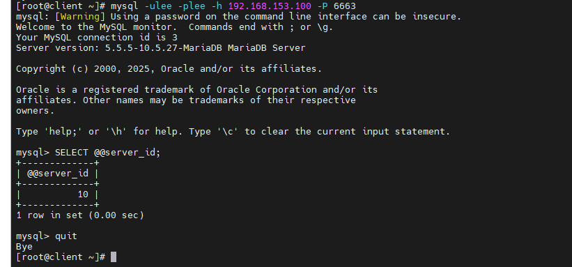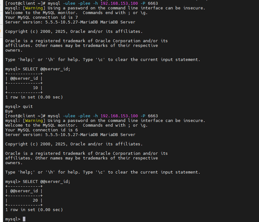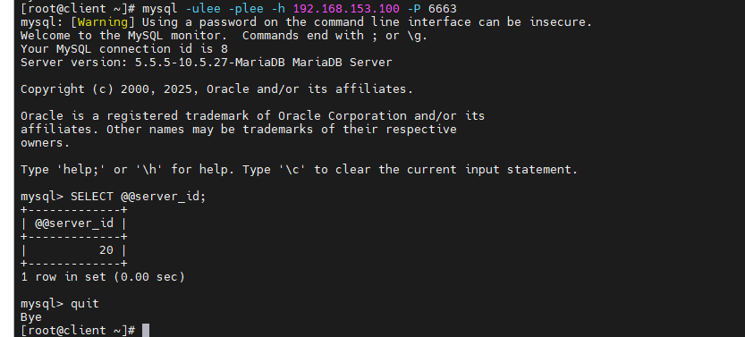 [root@client ~]# mysql -ulee -plee -h 192.168.153.100 -P 6663