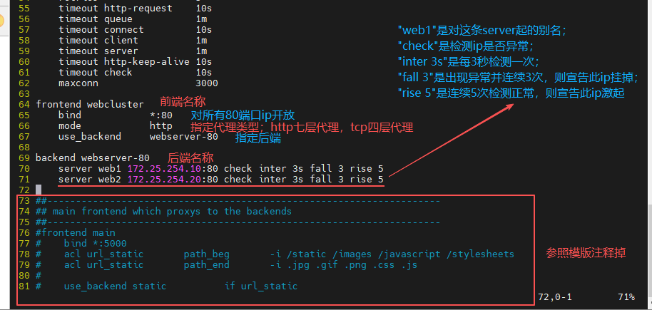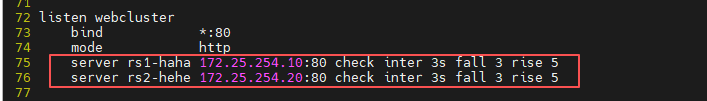 71 server web2 172.25.254.20:80 check inter 3s fall 3 rise 5