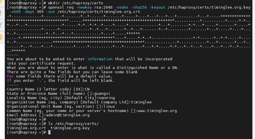 [root@haproxy ~]# openssl req -newkey rsa:2048 -nodes -sha256 -keyout /etc/haproxy/certs/timinglee.org.key -x509 -days 365 -out /etc/haproxy/certs/timinglee.org.crt
