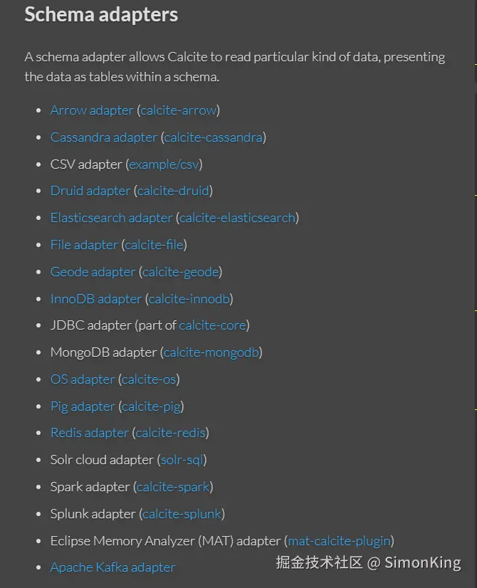 Calcite 通过 Adapters(适配器)来连接第三方数据源。每个适配器都让一种外部数据(如 CSV 文件、MySQL 数据库、Java内存对象、Redis 等)在 Calcite 看来像是一张可以通过 SQL查询的表。