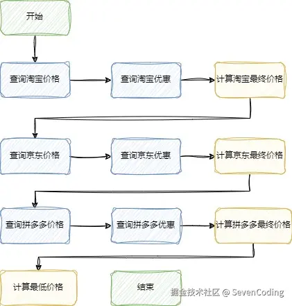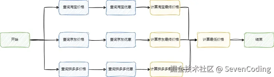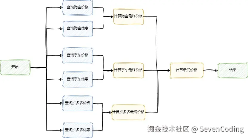 假设现在需求如下: 从网上查询某个产品的最低价格,例如可以从淘宝、京东、拼多多去获取某个商品的价格、优惠金额,并计算出实际的付款金额,最终返回价格最低的价格信息。