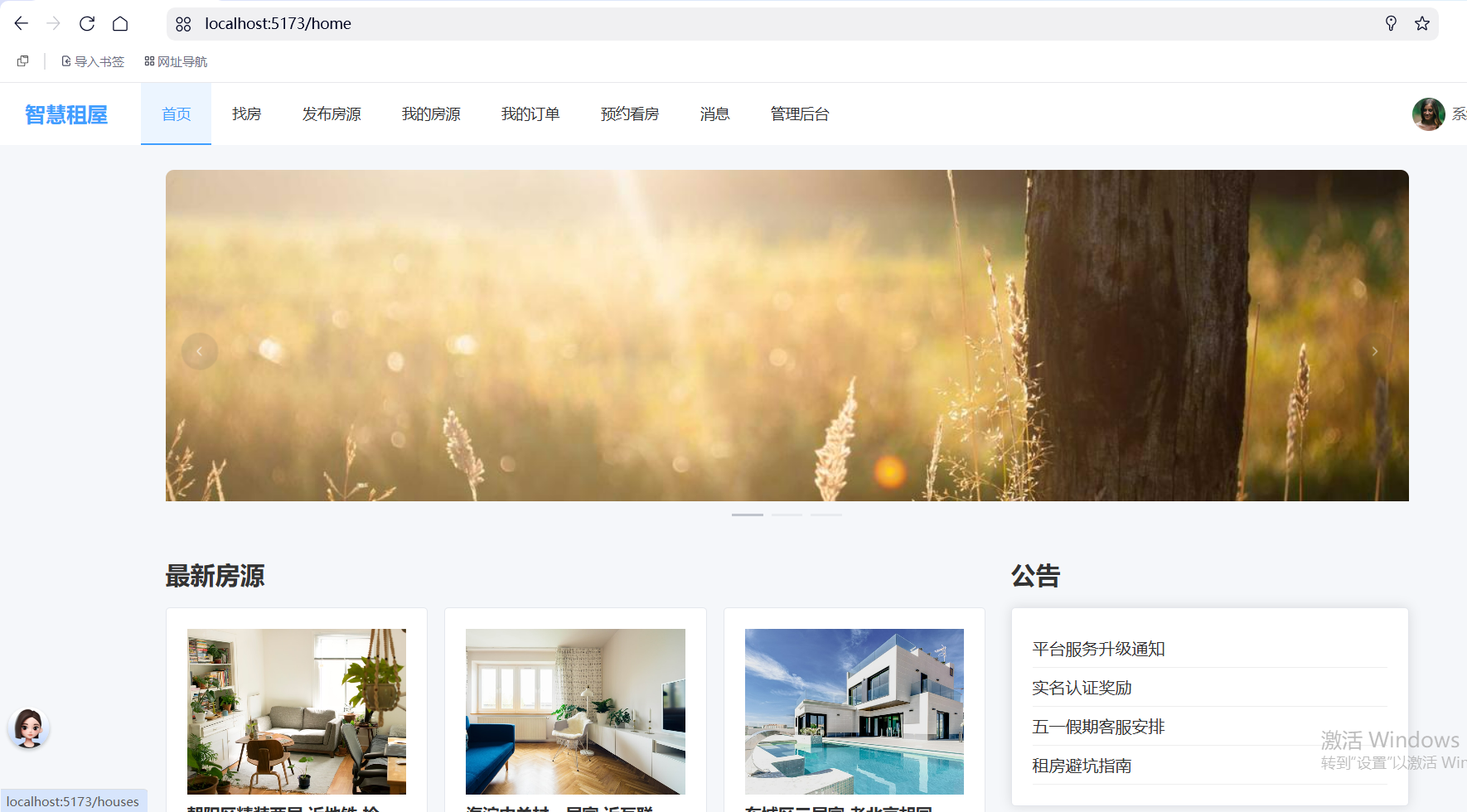 - 管理后台:数据统计、用户禁用/启用、房源审核、公告/轮播(数据表已建)