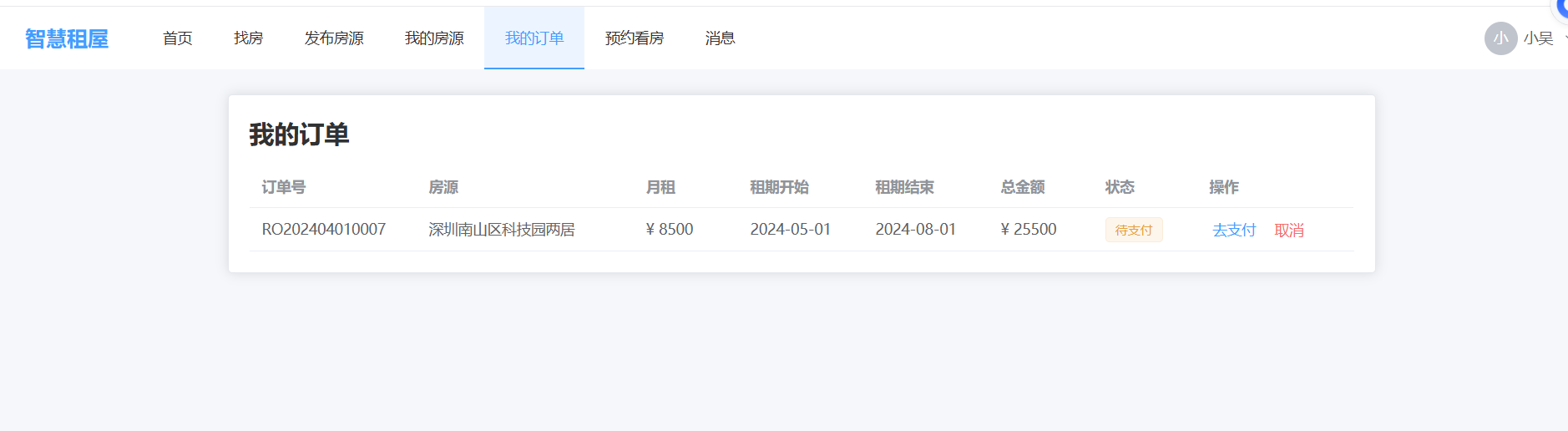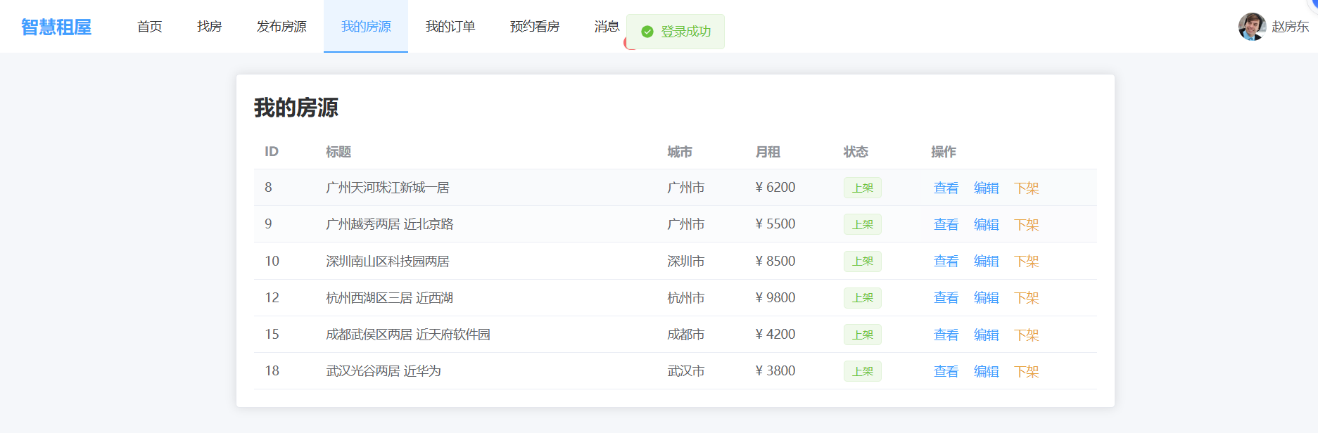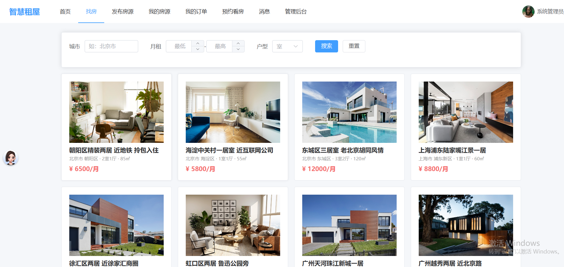 - 房源:发布/编辑、多图上传、状态(待审核/上架/下架/已出租)、搜索筛选(城市、价格、户型、面积)