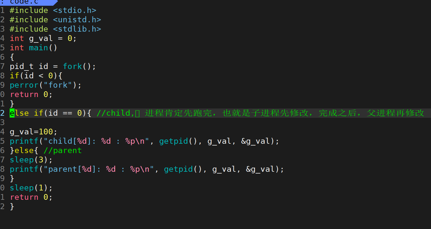 变量值不同:子进程里 g_val 是 100 ,父进程里 g_val 还是 0 。