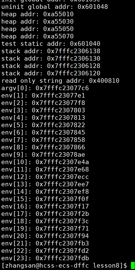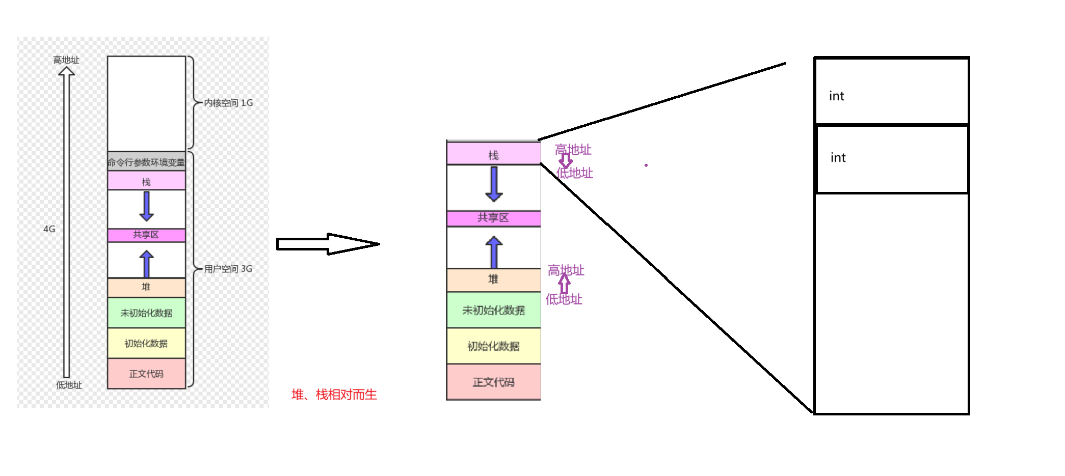 如下图可以看清楚代码段在低地址;只读数据段、数据段、BSS段依次向上;堆区从低地址向高地址增长;栈区从高向低地址增长;命令行参数和环境变量位于栈的最顶端。