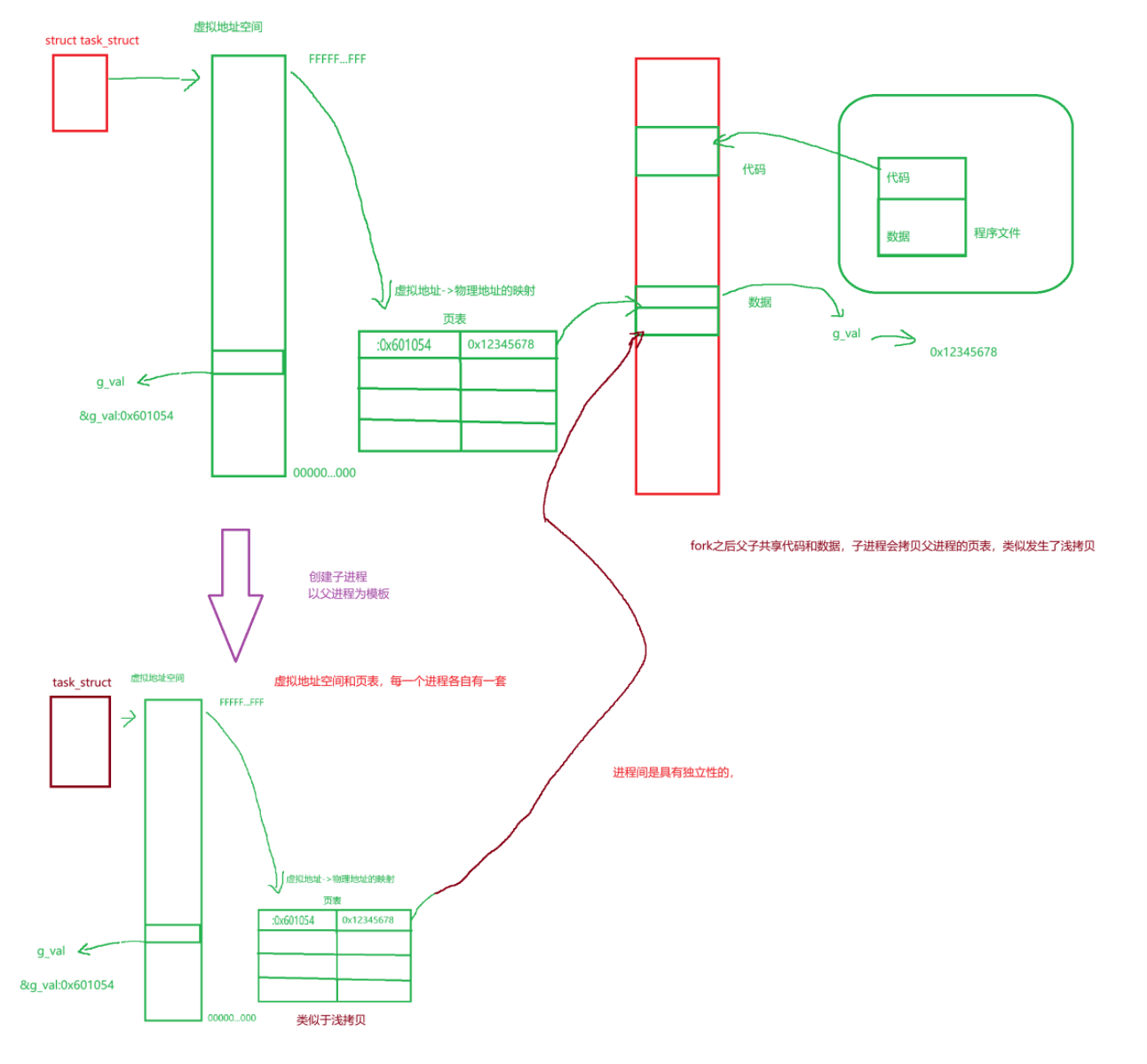 值不同:子进程修改 g_val 时,操作系统触发了写时复制(COW),给子进程单独分配了一块物理内存,把修改后的值存在了新的物理页上。所以,虽然虚拟地址相同,但它们实际对应的物理内存已经是两块不同的区域,因此值互不影响。