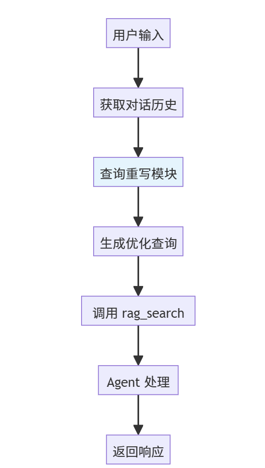 python# 在 agent_node 函数中修改检索调用 def agent_node(state: ChatState) -> dict: history = state.get("history") or [] input_text = state.get("input_text") or "" # 在调用 rag_search 前进行查询重写 optimized_query = query_rewrite_tool(history, input_text) # 使用优化后的查询进行检索 agent_result = agent.invoke({ "messages": history + [HumanMessage(content=input_text)], "query": optimized_query # 传递优化后的查询 })3. 集成架构