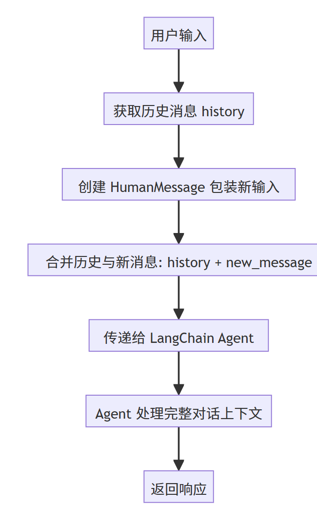 HumanMessage(content=input_text)包装当前用户输入- 合并后:完整的消息序列传递给 LangChain agent