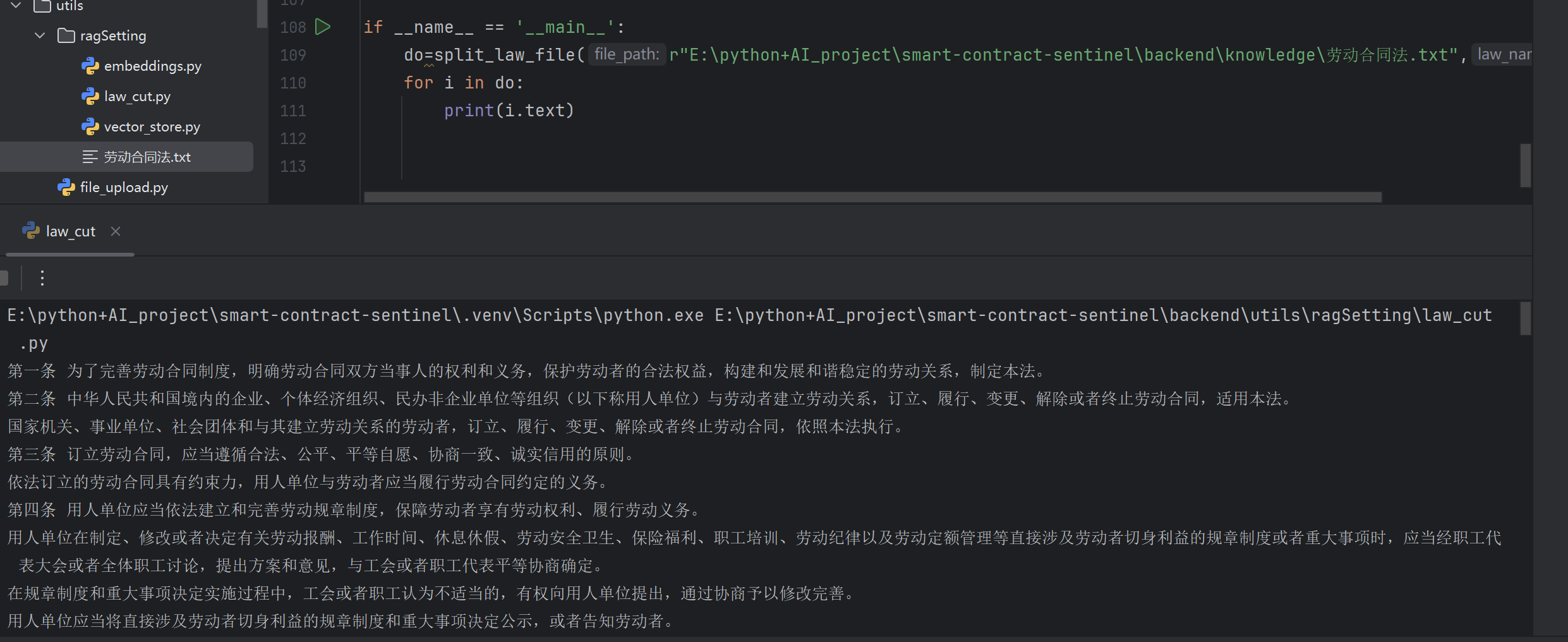 在 Smart Contract Sentinel 中,我们并没有简单地按字符数切分文档,而是针对法律条文的结构进行了定制化切分。