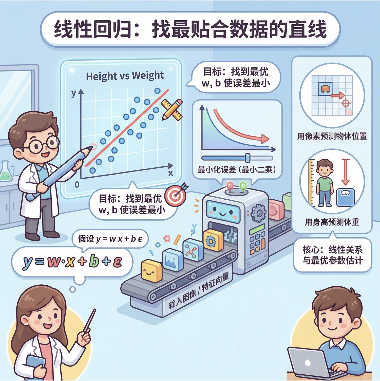 线性回归就像**「找一根最贴合数据点的直线」** ,比如用身高预测体重、用像素值预测物体位置。它的核心逻辑是:假设输入特征 x 和输出标签 y 之间满足线性关系 y=wx+b+ϵ(ϵ 是噪声),我们的目标是找到最优的权重 w 和偏置 b ,让预测值和真实值的误差最小。