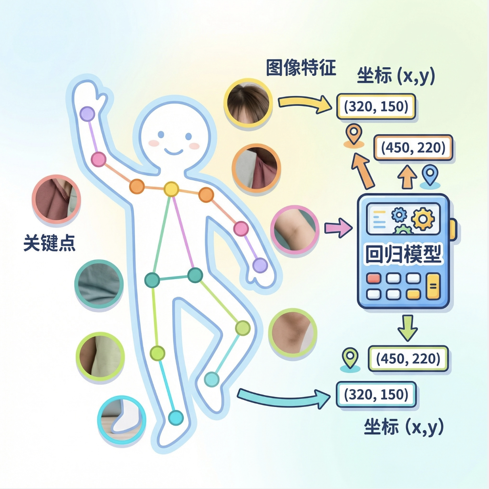 人体姿势估计是回归模型在计算机视觉中的经典应用:把图像中的关节点(比如手肘、膝盖)的坐标作为回归目标,用图像特征(比如关键点周围的像素)预测关节点的 (x,y) 坐标。
