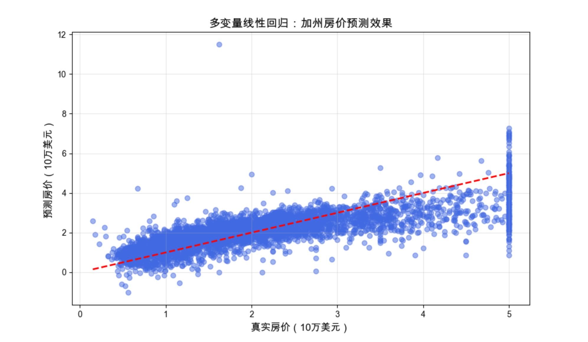 散点越靠近红色虚线,说明预测越准确,直观展示了多变量回归在真实场景中的应用效果。
