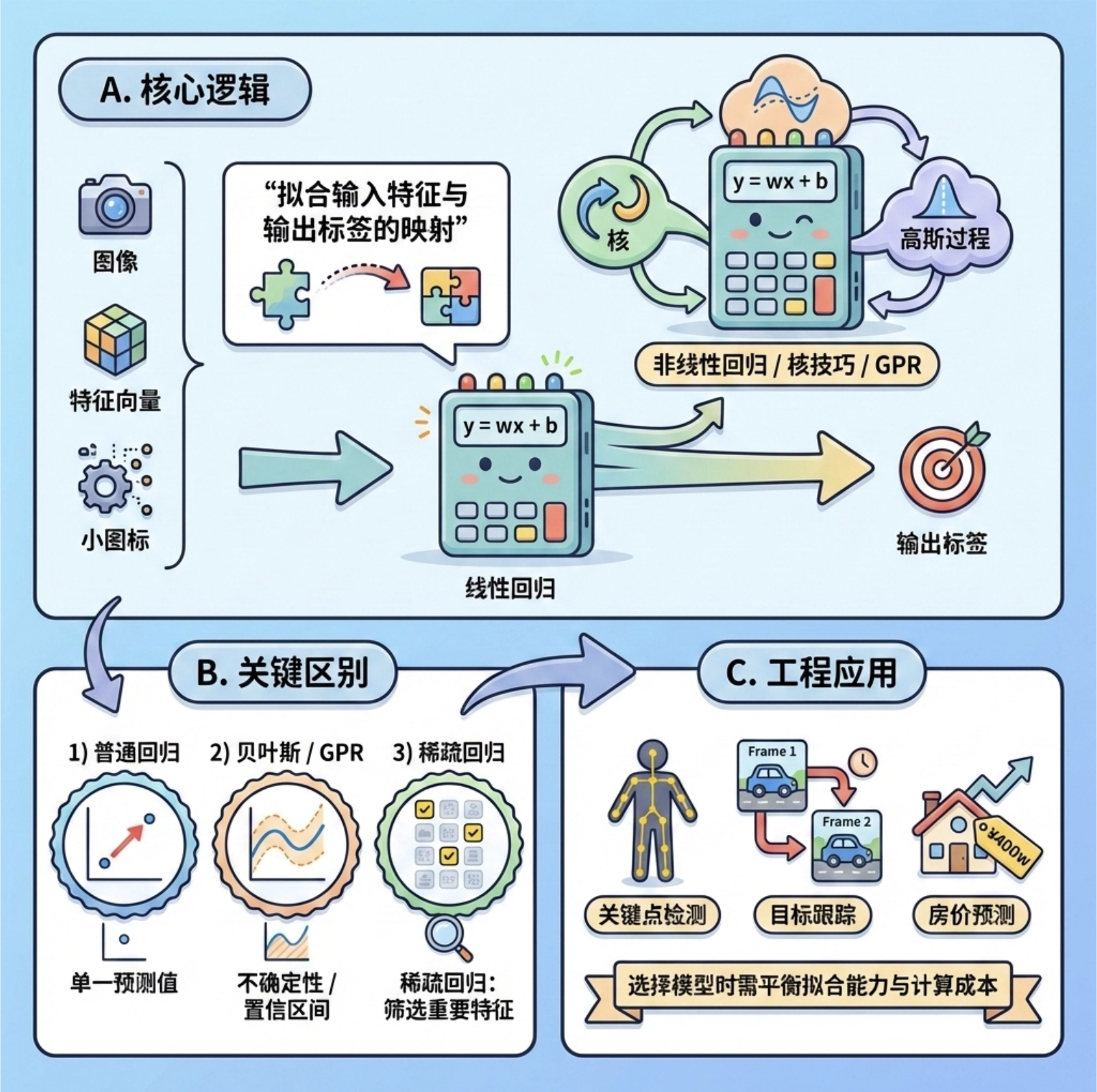 3.工程应用 :计算机视觉中,回归模型常用于关键点检测、目标跟踪、房价预测等场景,选择模型时需平衡拟合能力和计算成本。