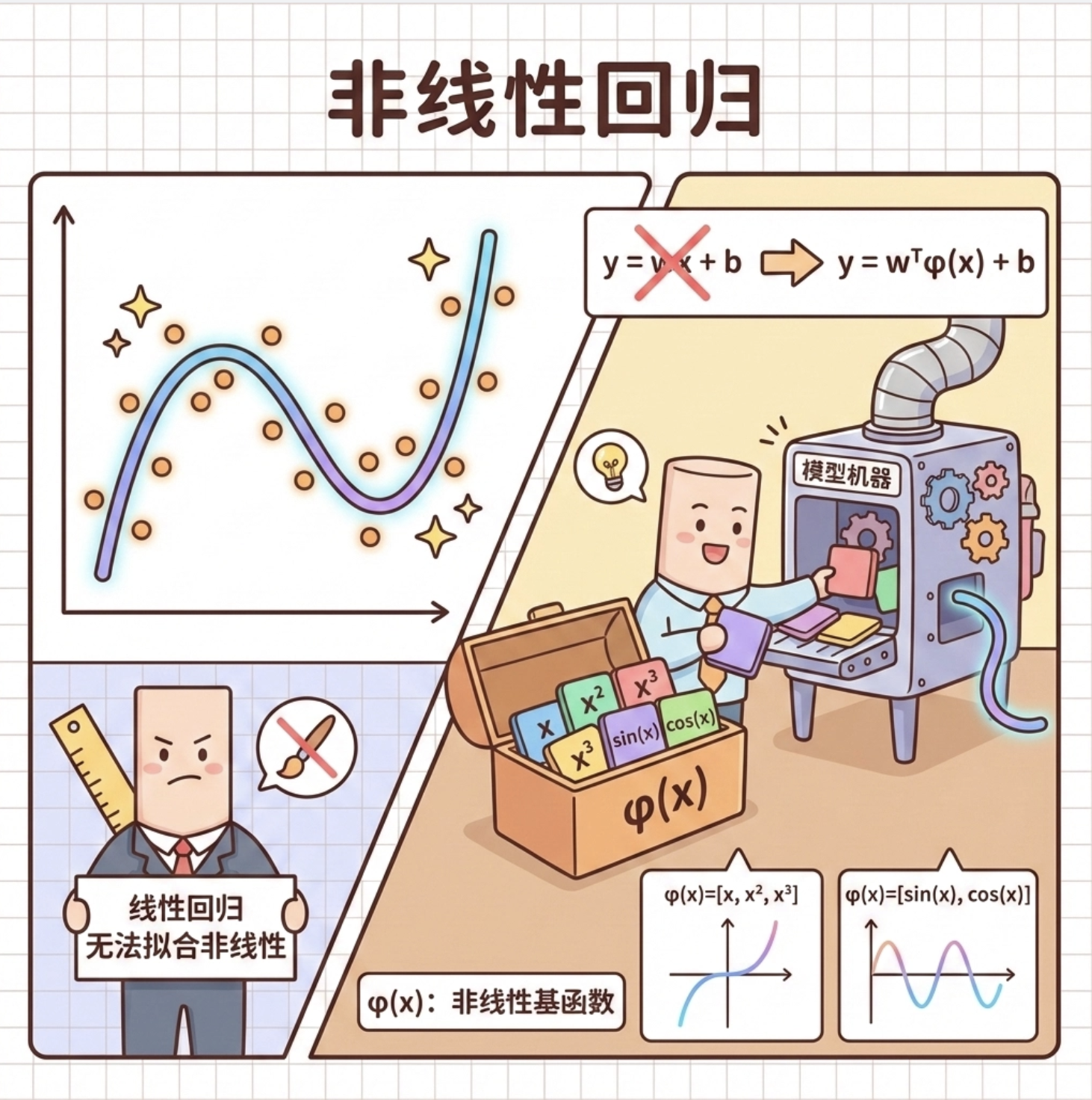 1.核心逻辑 :回归模型的本质是「拟合输入特征和输出标签的映射关系」,线性回归是基础,非线性回归 / 核技巧 / GPR 是对线性回归的扩展,解决非线性问题;