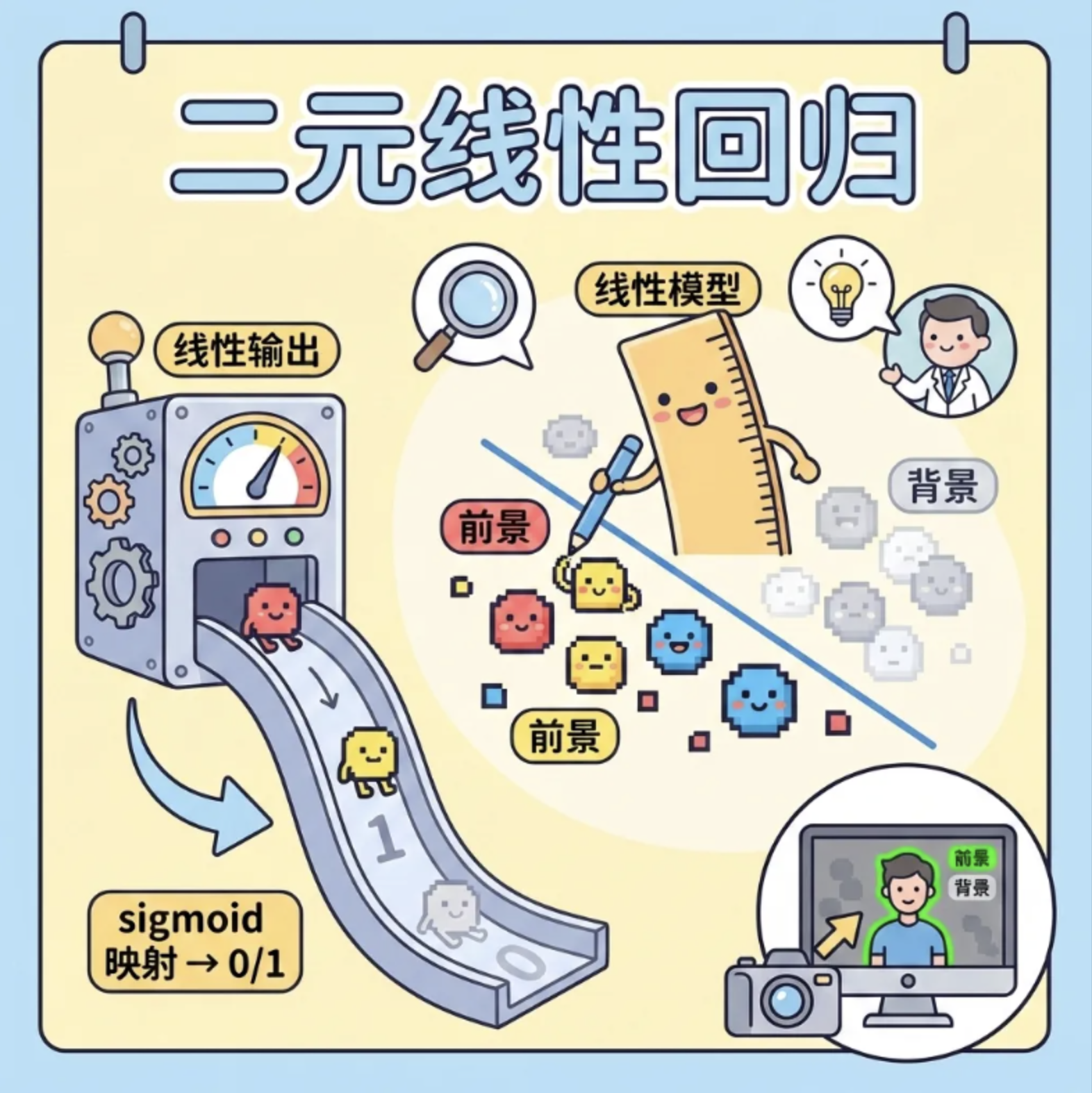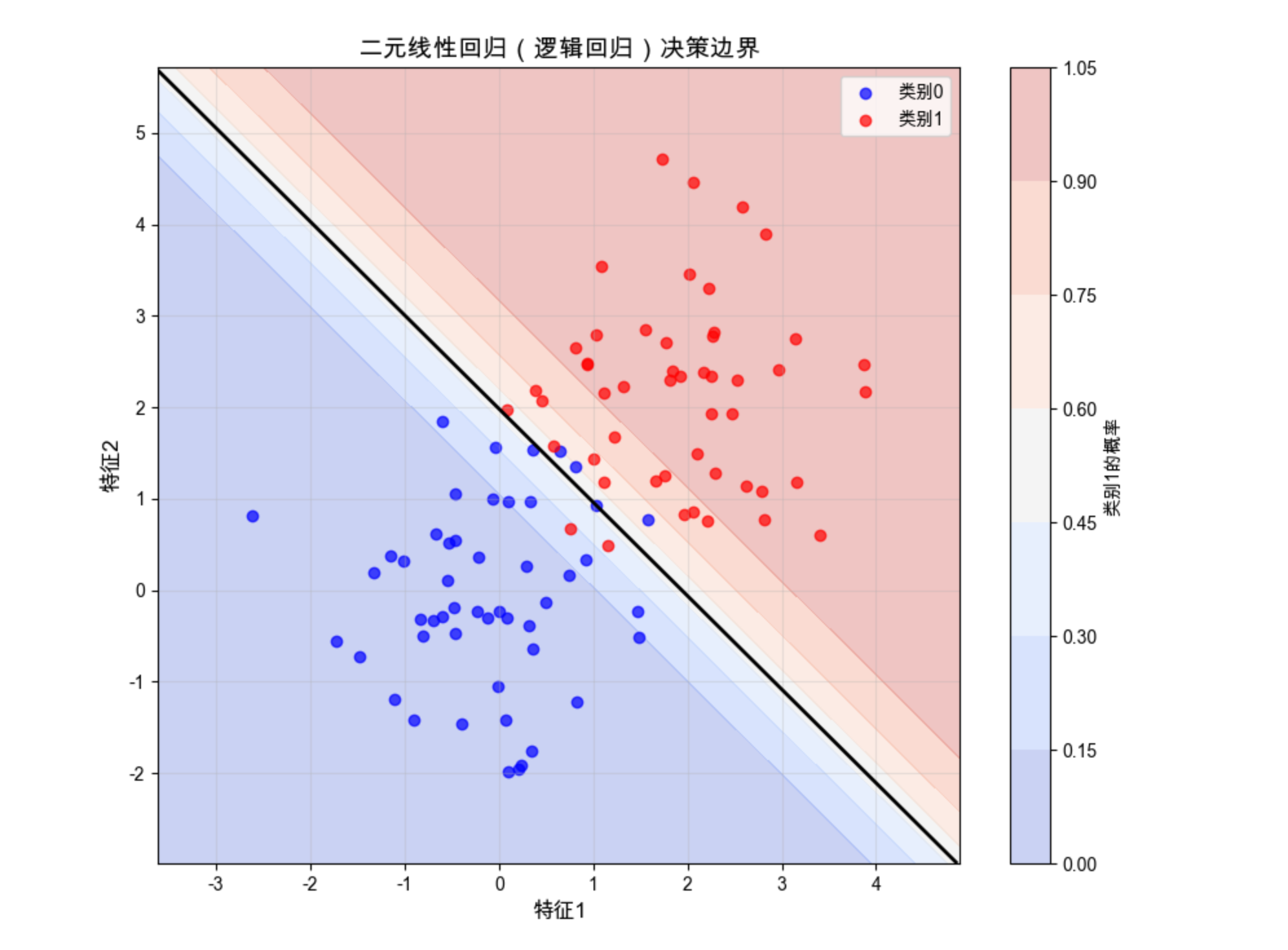 黑色直线是决策边界(概率 = 0.5),红色区域是类别 1 的高概率区,蓝色区域是类别 0 的高概率区,直观展示了二元线性回归的分类效果。